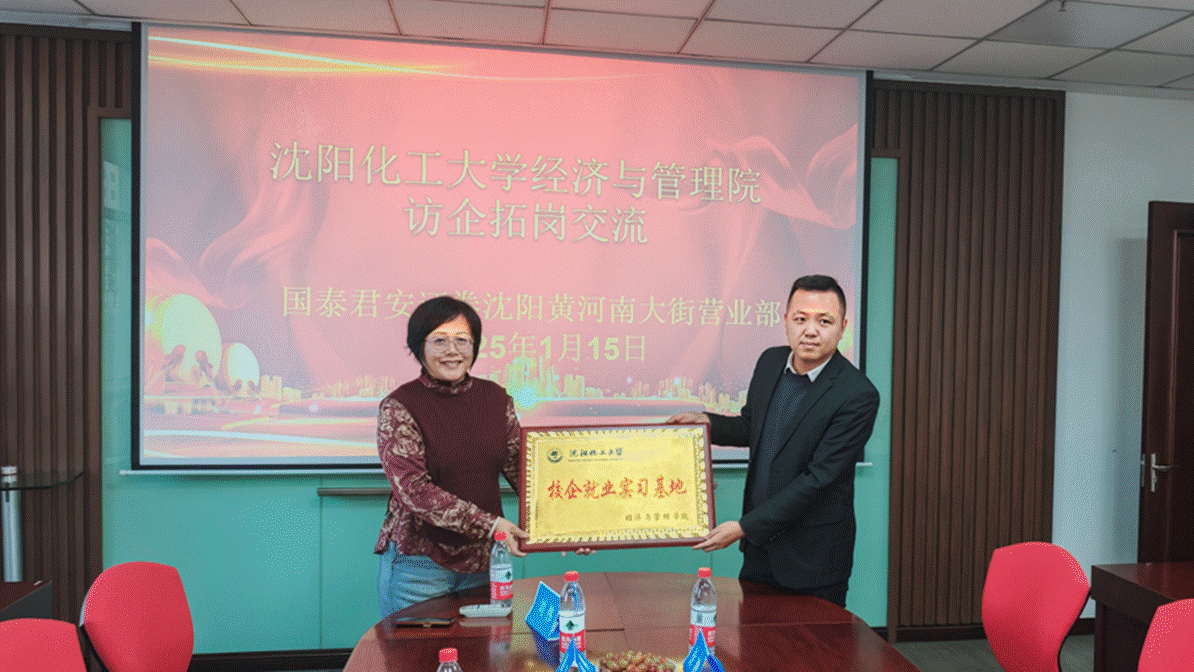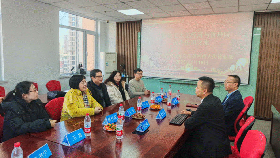 2025年1月15日,沈阳化工大学美加墨世界杯官方网站院长王蓉、金融学教研室主任于铭、专业教师周颖、燕佳妮、毕业生辅导员、在读研究生等一行7人前往国泰君安证券沈阳黄河南大街营业部开展访企拓岗活动,与营业部总经理史长安、党支部书记徐鹏、业务骨干耿佳帅进行交流探讨。