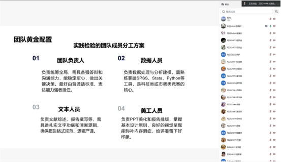 刘海欣同学首先结合自身经历,为同学们梳理了适合会计专硕学子参加的各类专业比赛,分析了不同比赛的赛事特点、参赛要求和能力提升点,建议同学们结合自身的专业特长和发展规划选择适合的比赛;在赛前准备环节,她强调了赛前选题、资料收集、方案设计的重要性,分享了自己赛前打磨作品、开展模拟训练的方法和技巧;针对比赛中的团队协作问题,她表示,优秀的团队协作是比赛取得好成绩的关键,要注重团队成员的合理分工、有效沟通和默契配合,在比赛中凝聚团队力量。